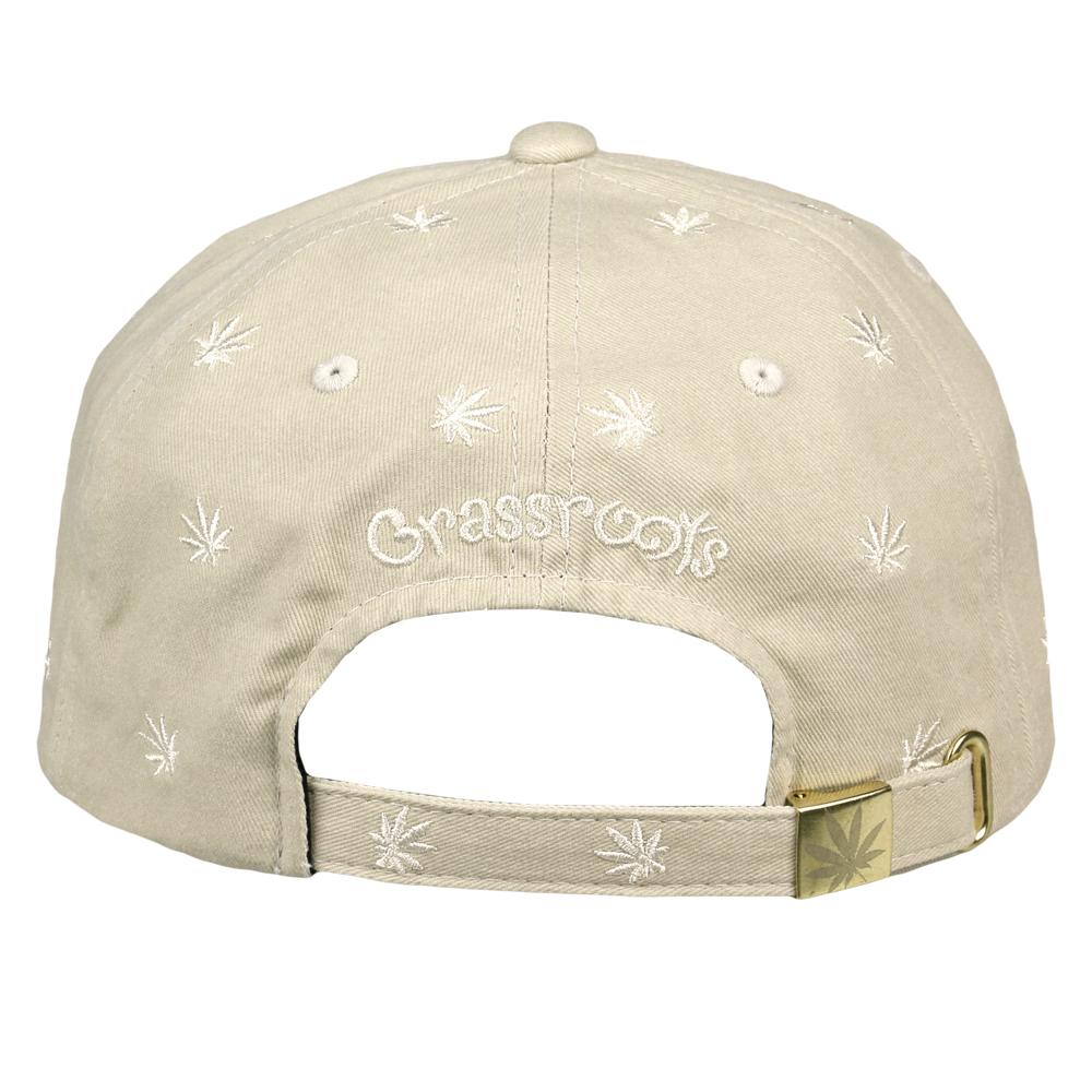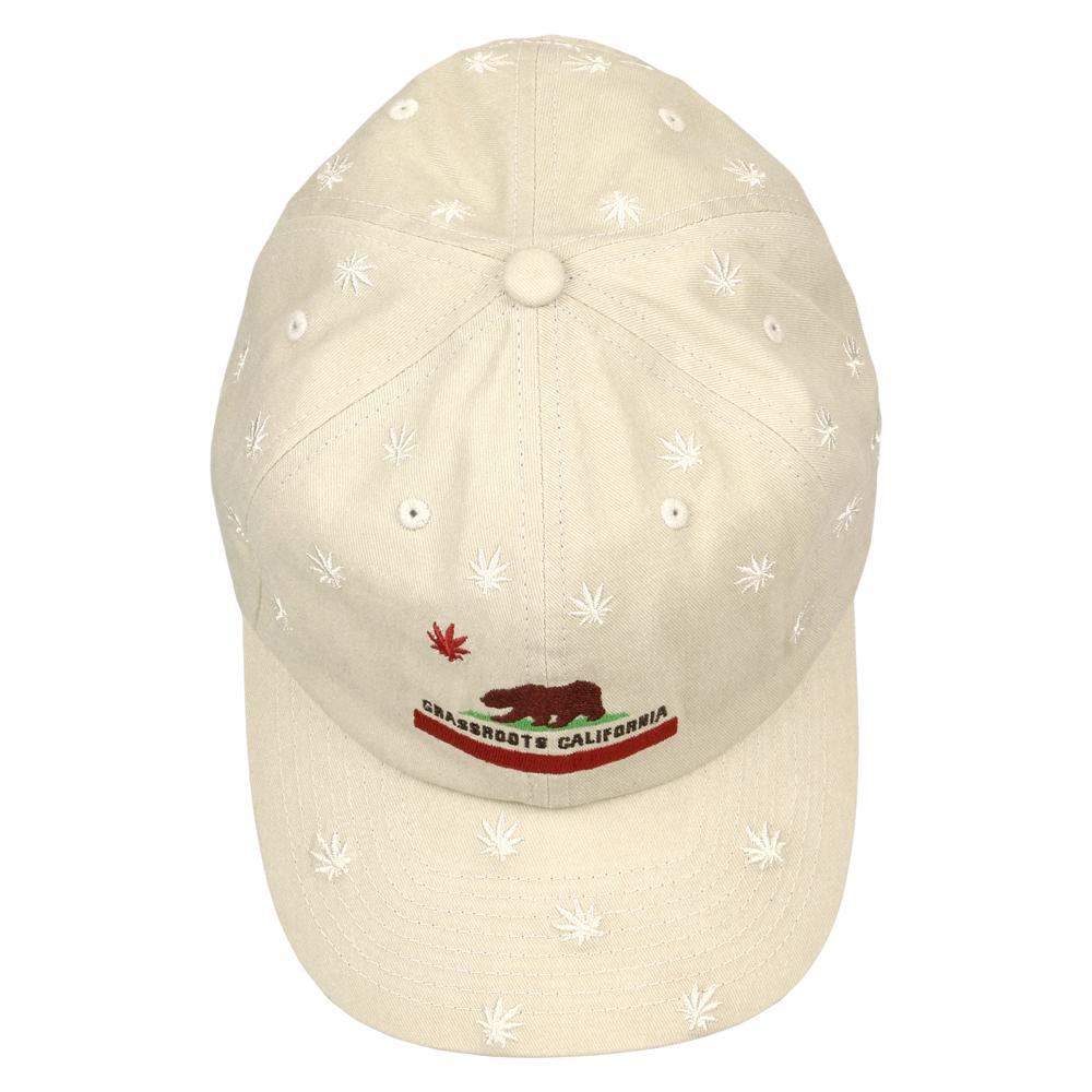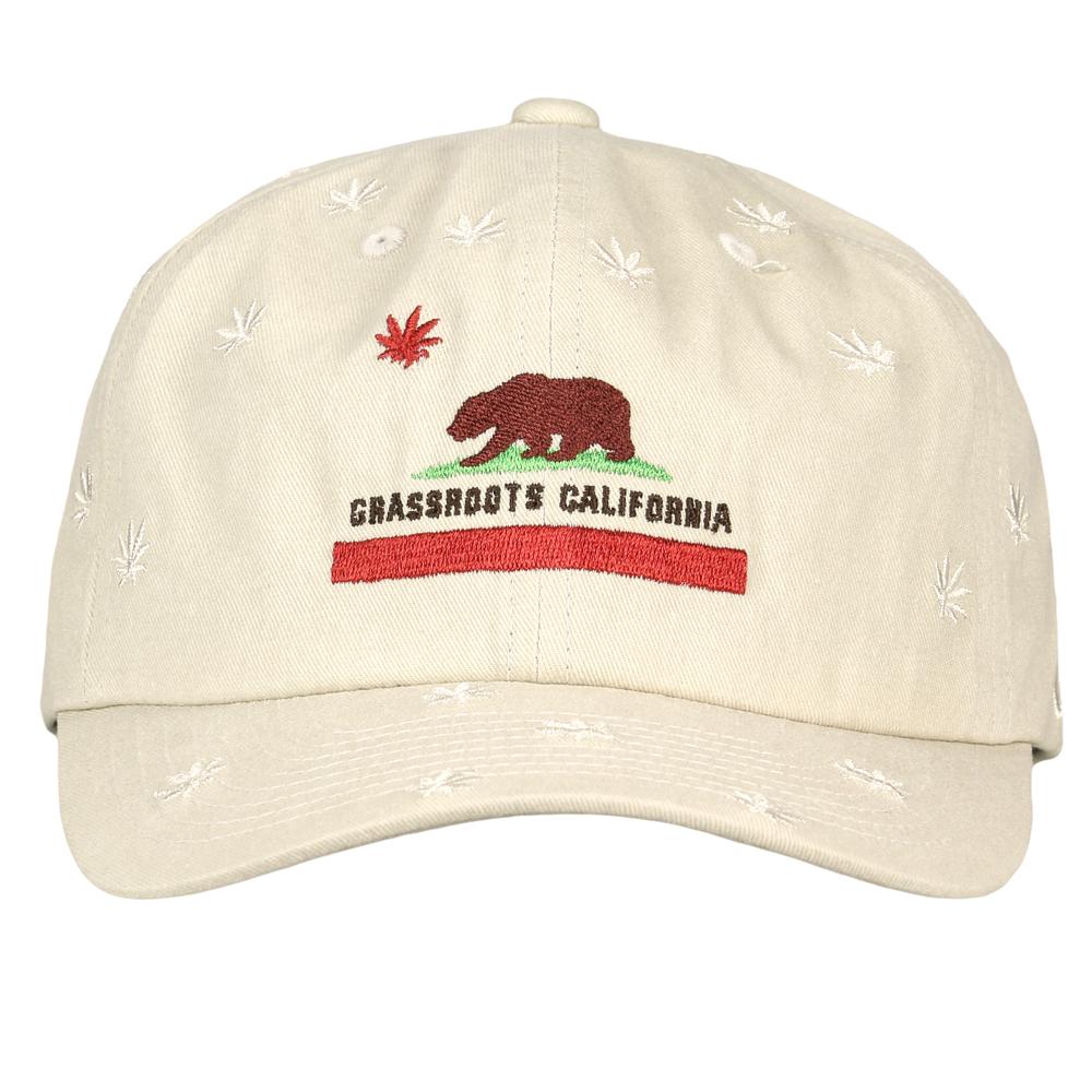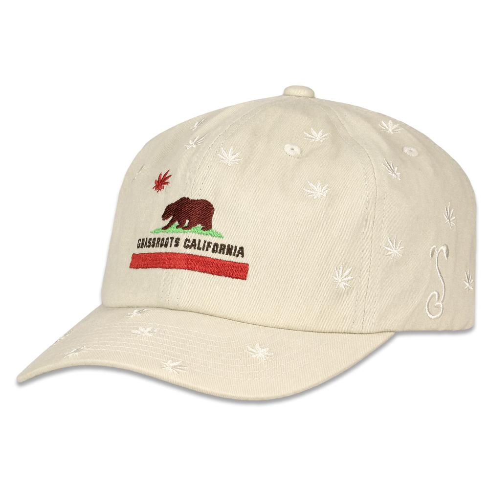 The California Flag has some pretty iconic symbols, from the California Grizzly Bear, to the single red star and red stripe, and this hat celebrates just that! But what represents Cali better than some loud? This deconstructed, tan dad hat features a red cannabis star as the flag does, and is embroidered all over with tan cannabis stars. The text reads "Grassroots California" and adjustable strap in the back is finished with a gold cannabis star.
