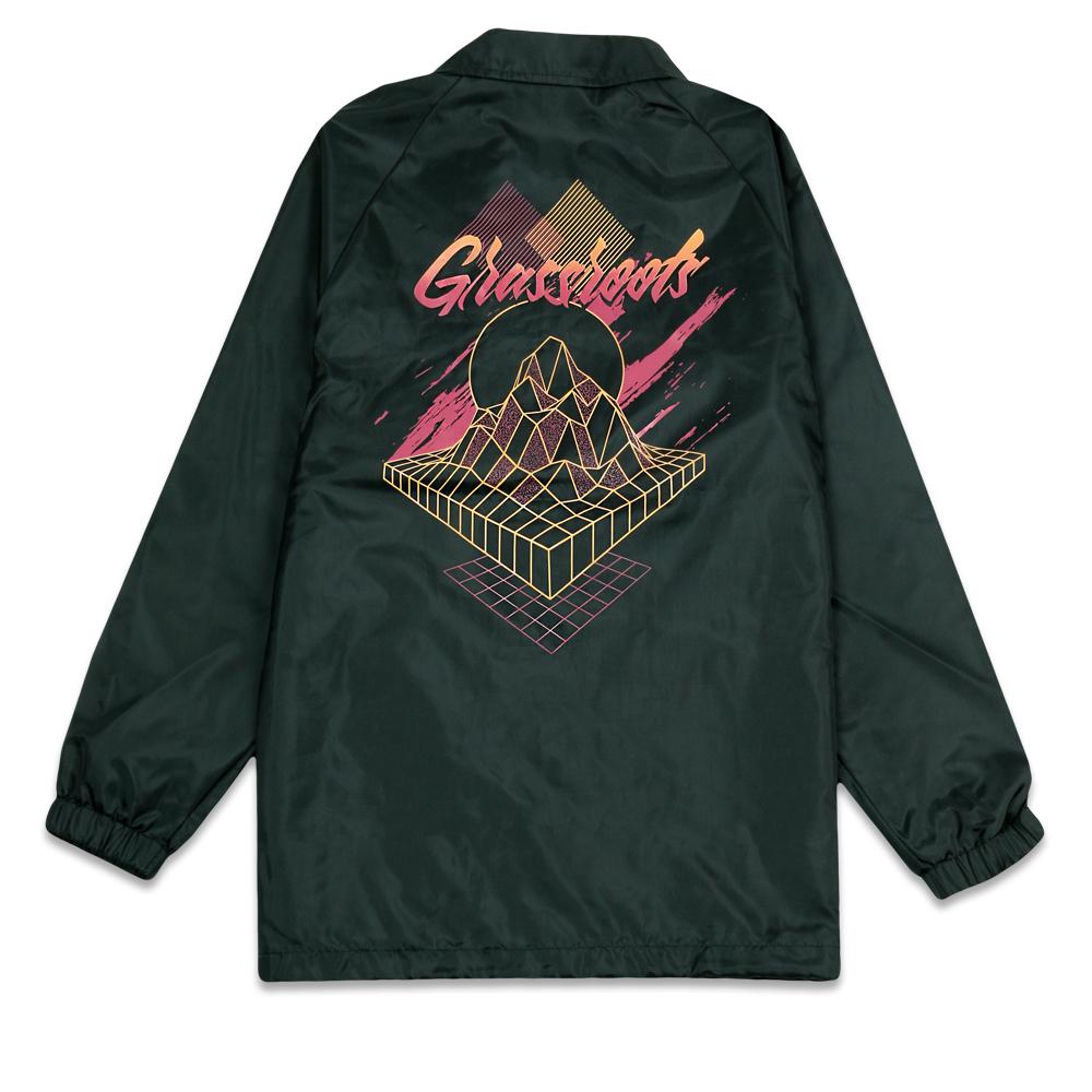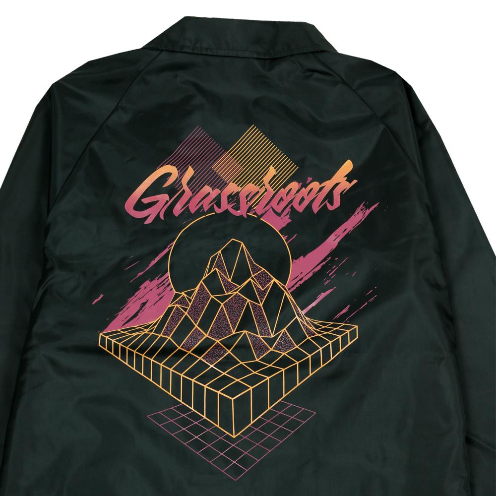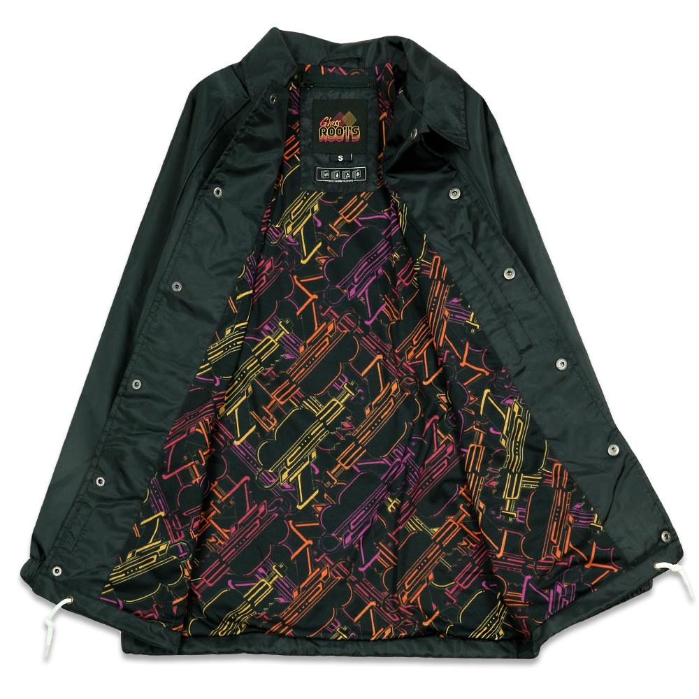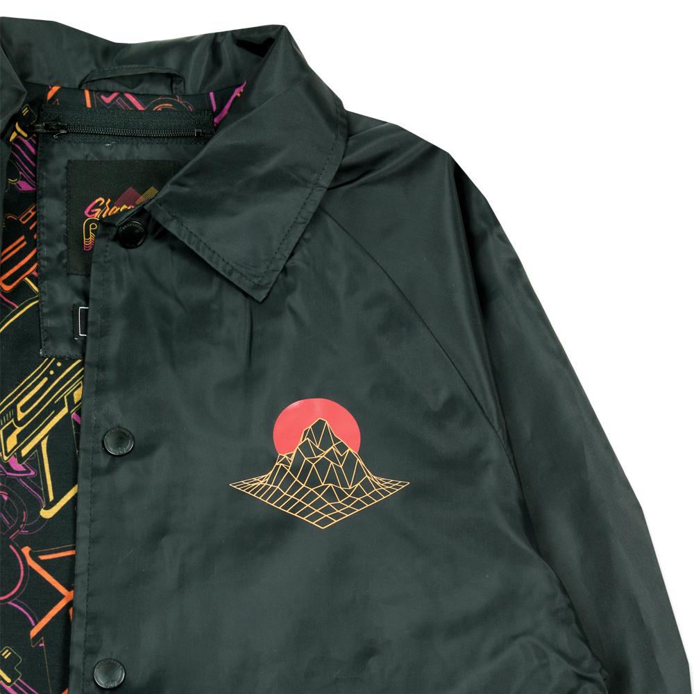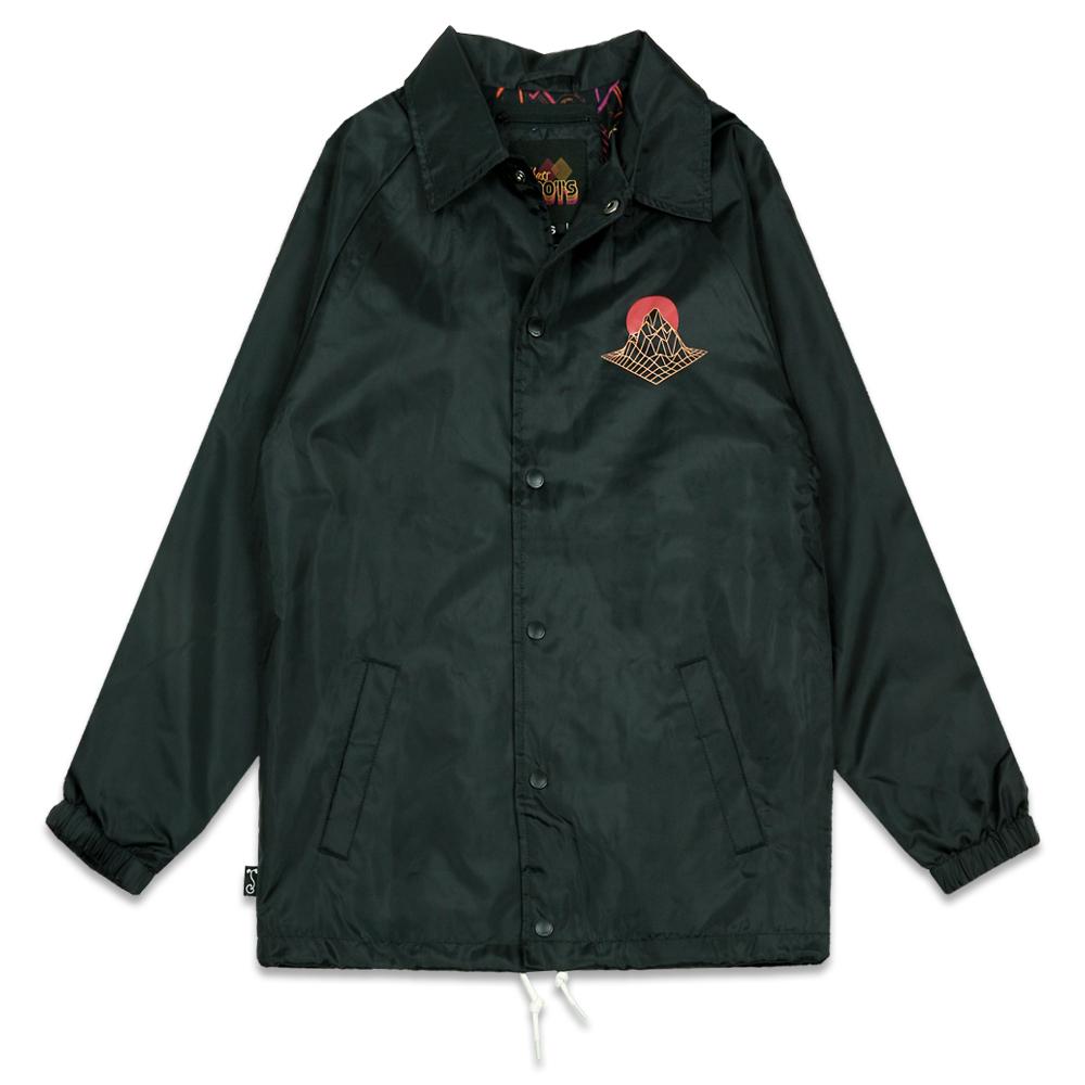 The Danger Zone collection is inspired by the retro vibes from 80s ski garb, jet skis, and arcade games! This black coaches jacket features a print of our Danger Zone low poly arcade-style mountain graphic on the back and a smaller one on the front. The Super Stoker artwork is featured on the jacket's lining. This button-up jacket includes a drawstring on the bottom and a stash pocket on the inside along the tag at the neck. Dig this style? Check out the rest of our Danger Zone styles in the Fall/Winter 2018 collection!