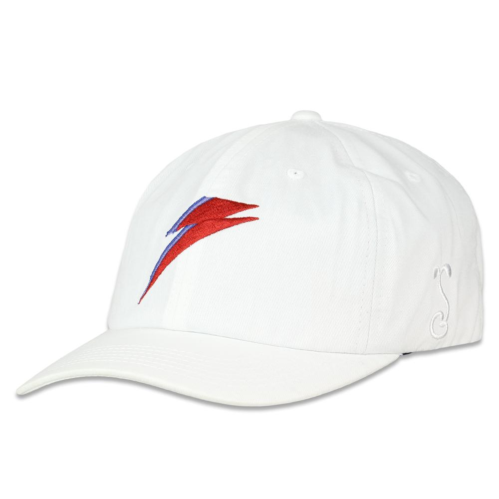 This white dad hat is simple and stunning. With a red and blue Bowie bolt embroidered on the front, you can sport and support David Bowie casually with this every day.
