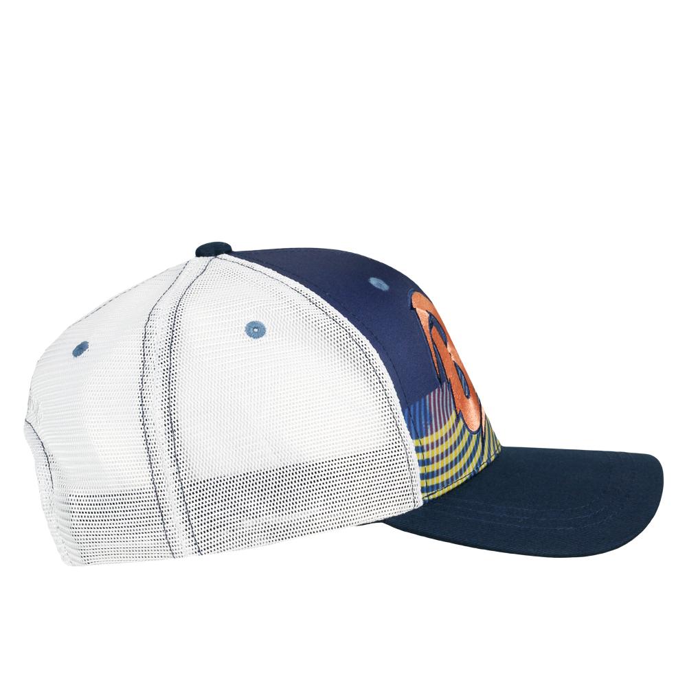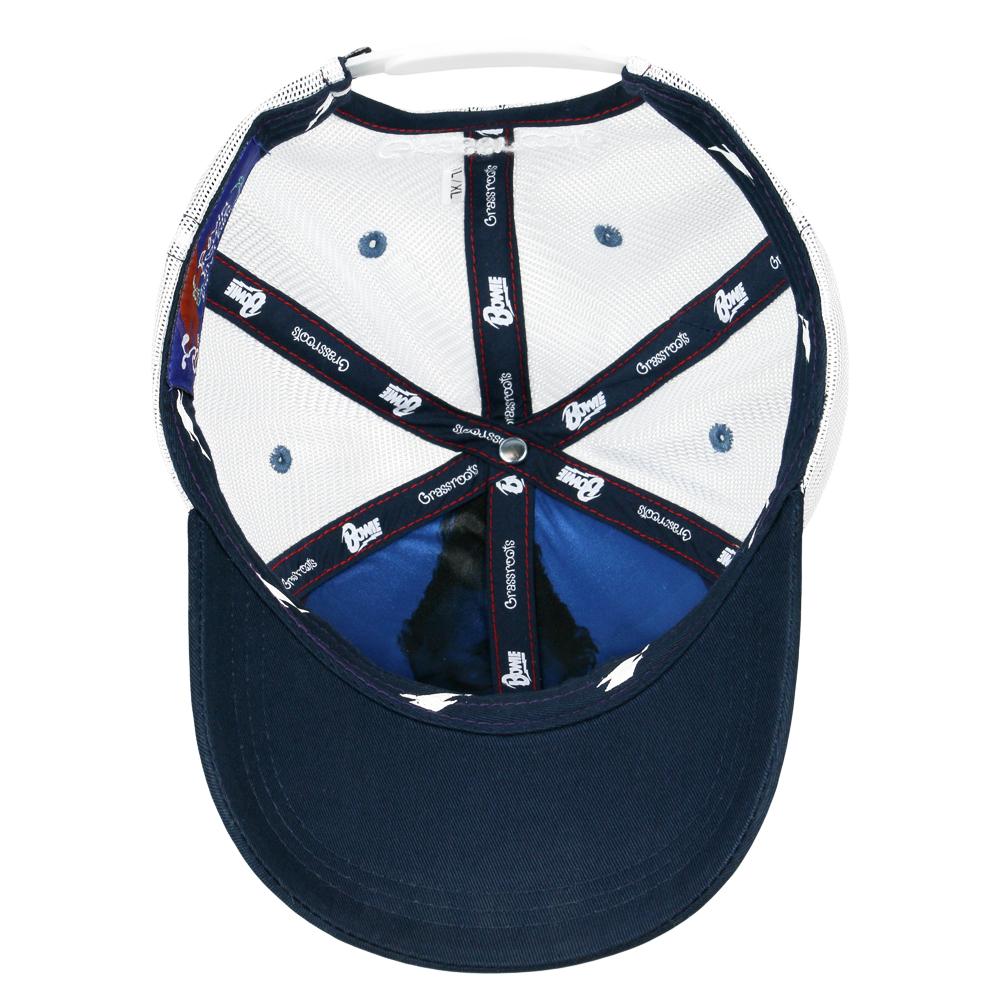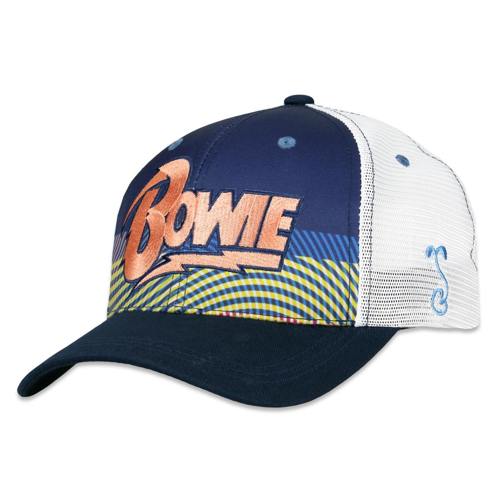 This navy dad hat features an orange, Bowie-script logo across the front with a psychedelic back yellow and blue back drop that puts you right back in the groovin' 70s. Complete with white trucker mesh panels, this is a simple, casual way to show off your favorite glam rock star.