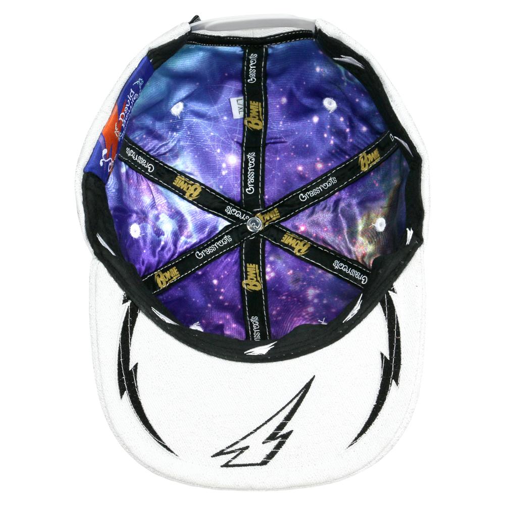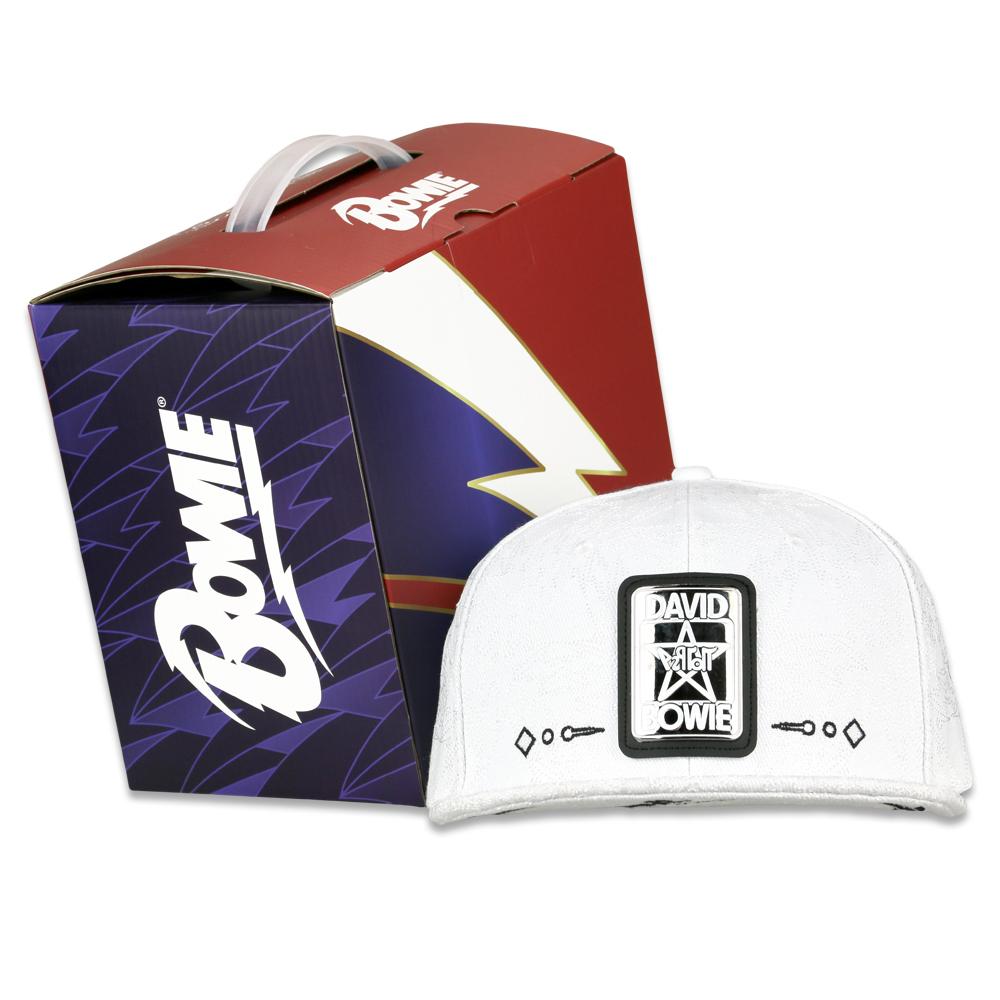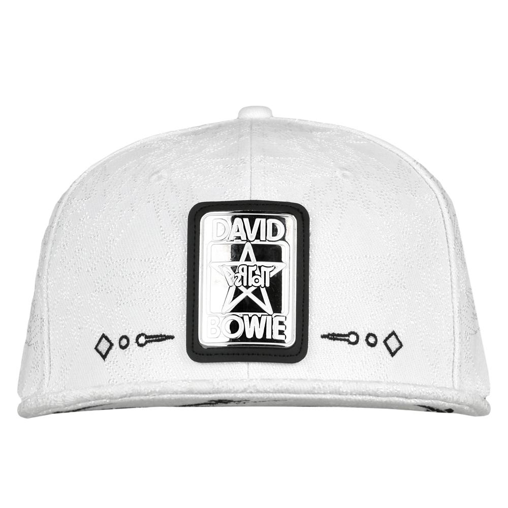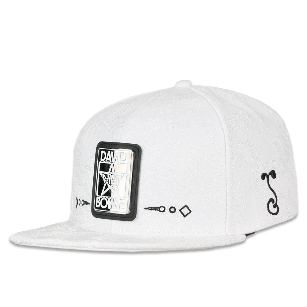 This white snapback is covered in all-white embroidery and a metal emblem on the front embossed with a white Star of David Bowie. The embroidery continues all over the brim with a black Bowie Bolt underneath.