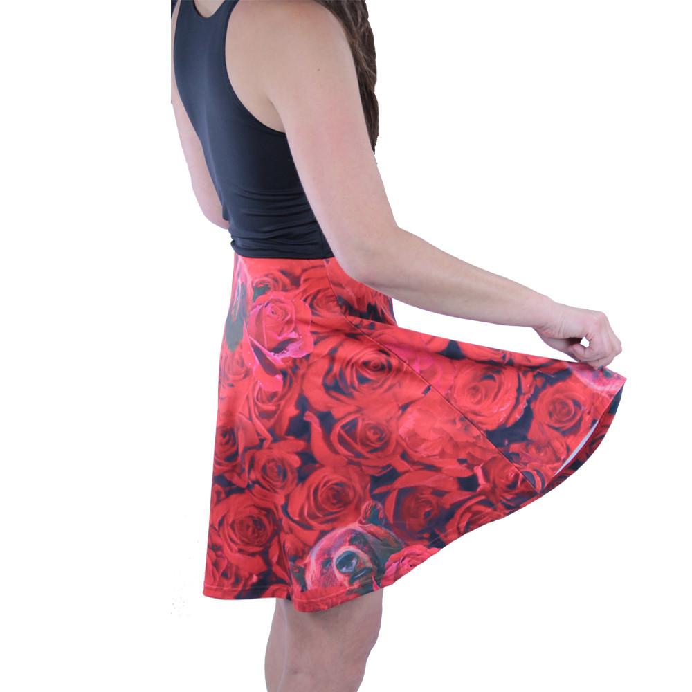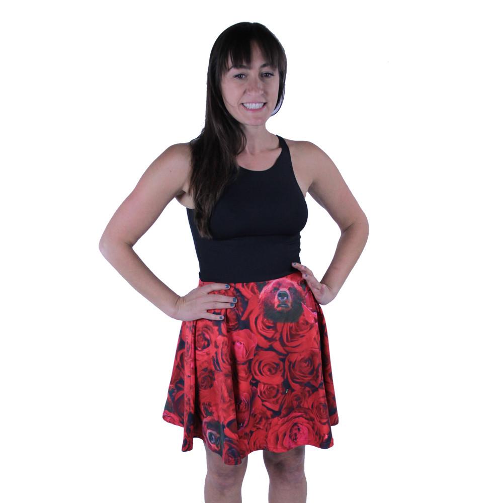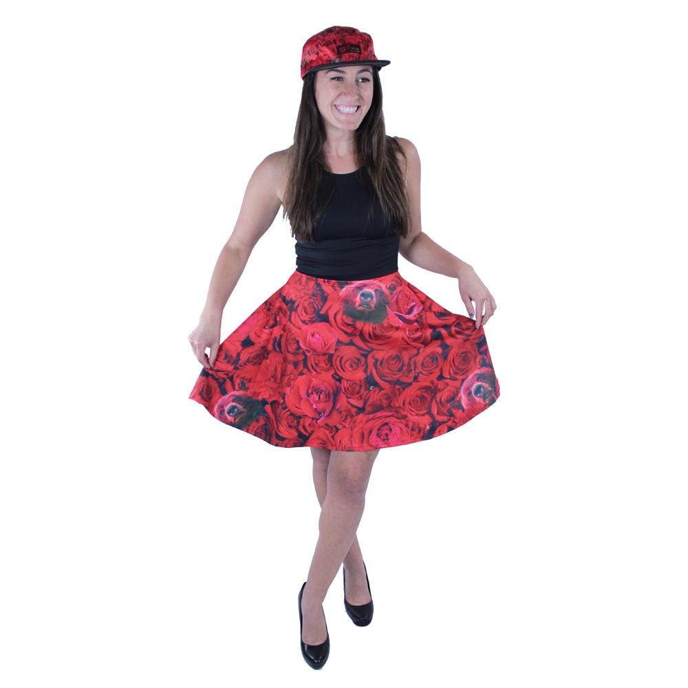 The flamenco dress is lightweight and stretchy to hug you in all the right places. The bottom half of this dress is made to look like a high waisted skirt, featuring the flamenco rose and bear design. The top half is a simple black high neck tank top.