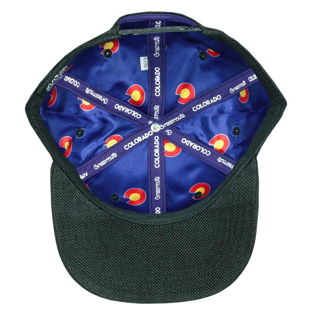 Love Grassroots? Love Colorado? This is the flat brim for you! This black hemp snapback revisits our OG "GRC" logo, now inspired by Colorado State Flag. The print inside features our Colorado "C" pattern and we've embroidered "Colorado" across the back to seal the deal. Available in sizes S/M and L/XL. Dig this style? Check out the Blue Hemp Fitted and other Grassroots Colorado-inspired designs.
