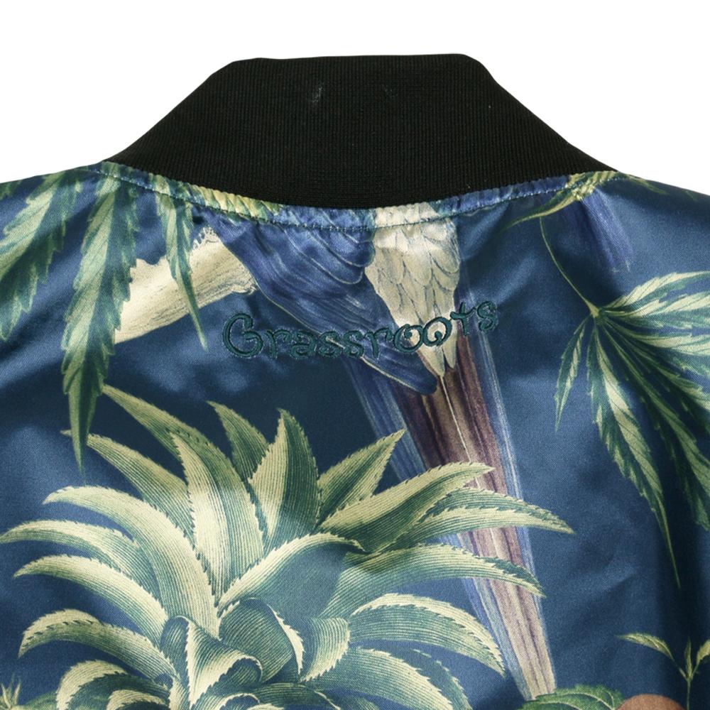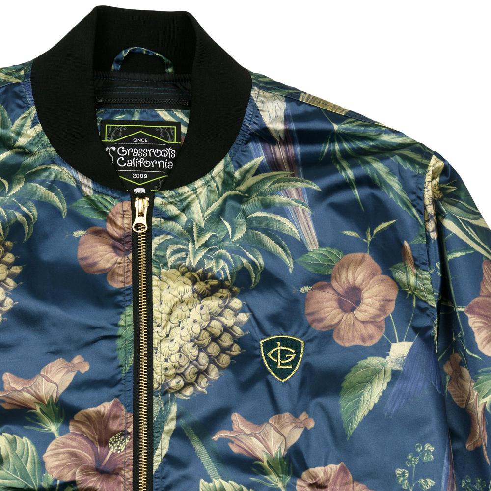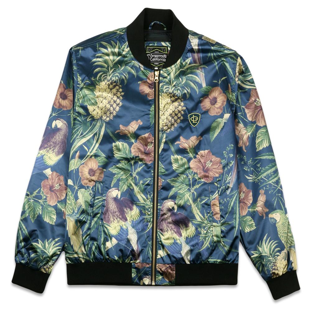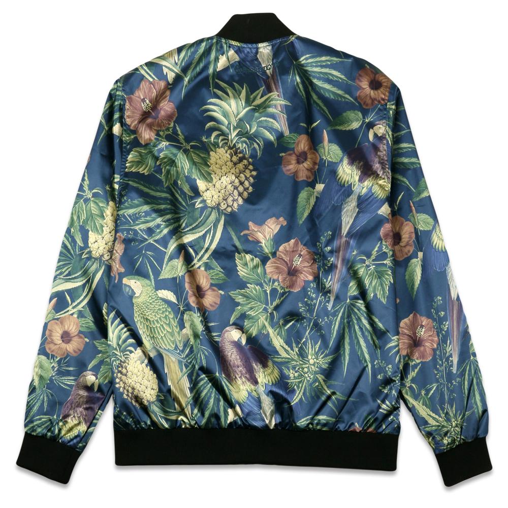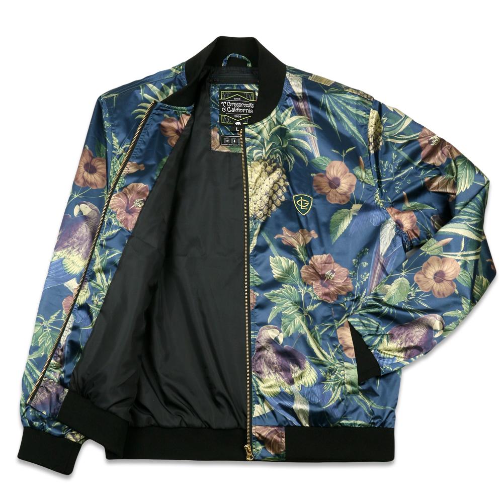 This navy bomber jacket is certainly a statement piece for only the pro-est of pros! Complete with the full-color birds of paradise, pineapple, and ganja print, golden zipper, and golden Greg Lutzka insignia, this bomber is flashy, fun, and fashion-forward!