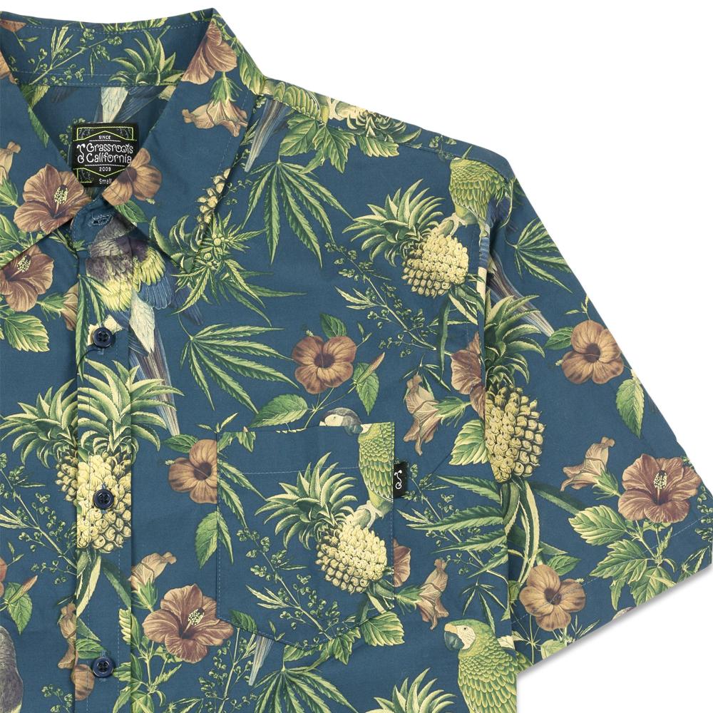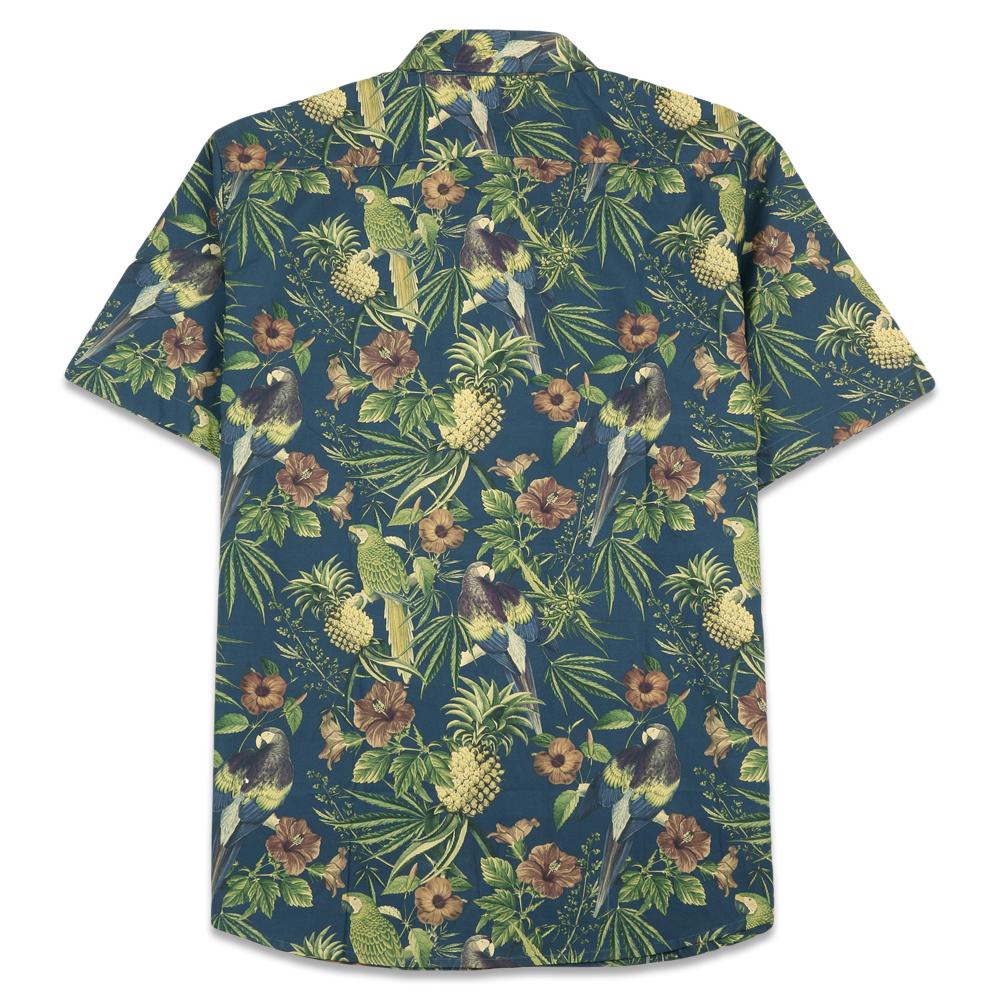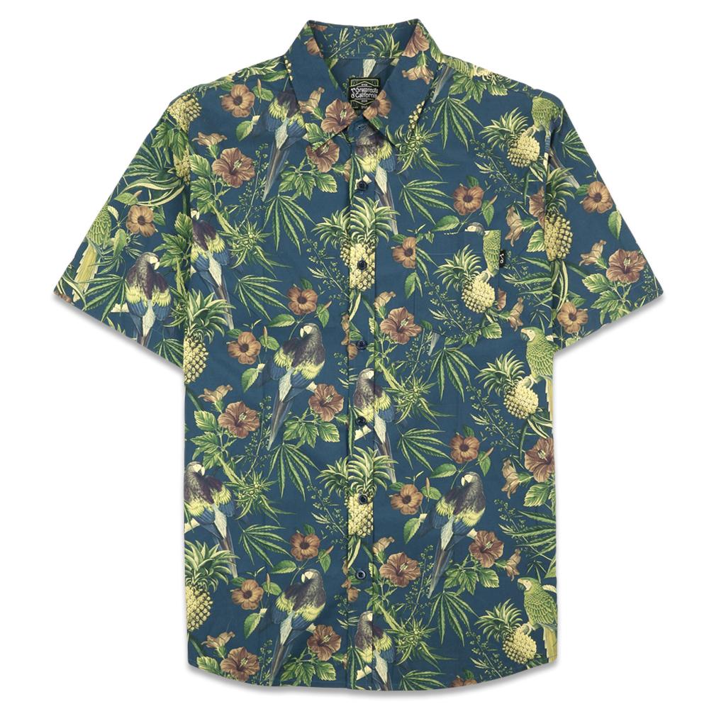 This all navy button up features the full-color print of the birds of paradise, pineapple, and ganja leaves all-over so you can make a statement at your grill-out or summer fest!