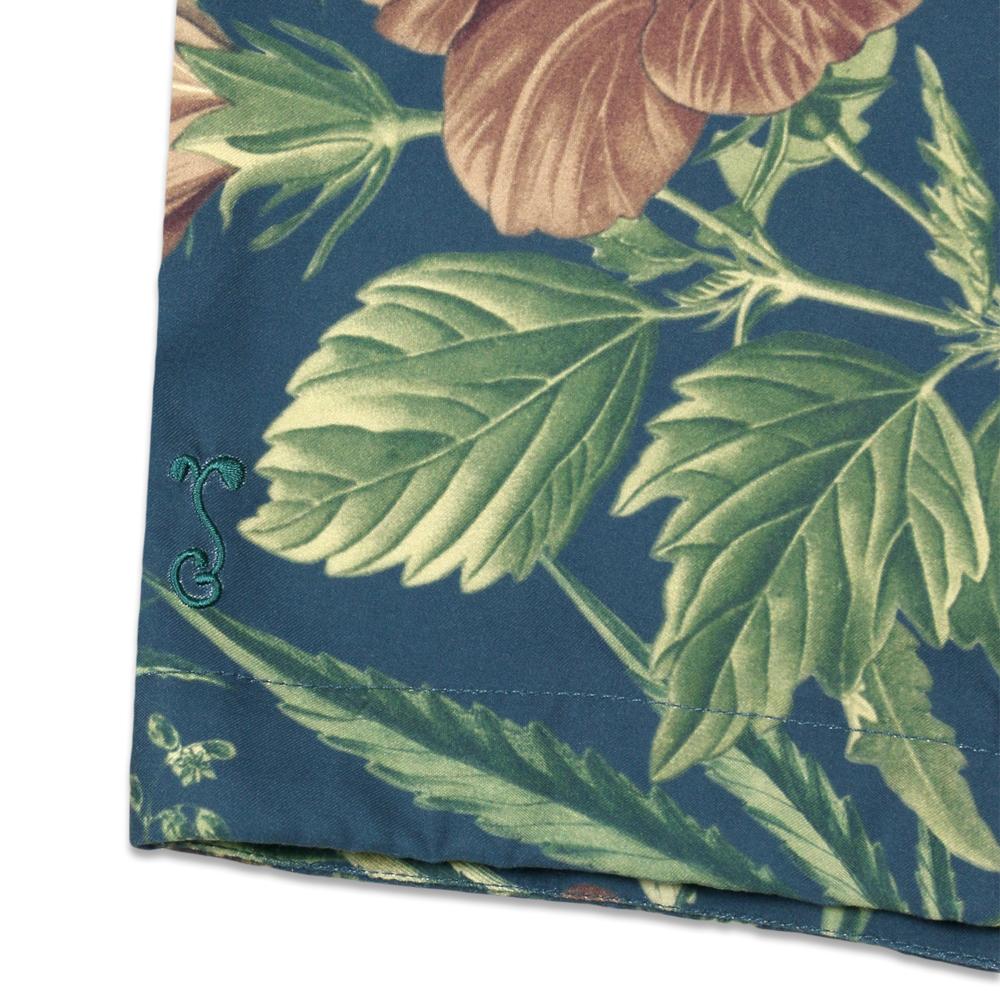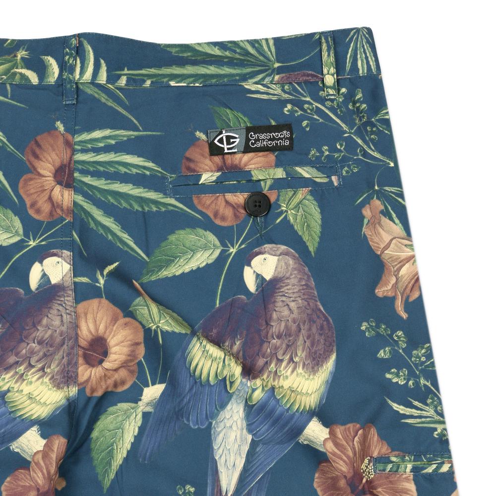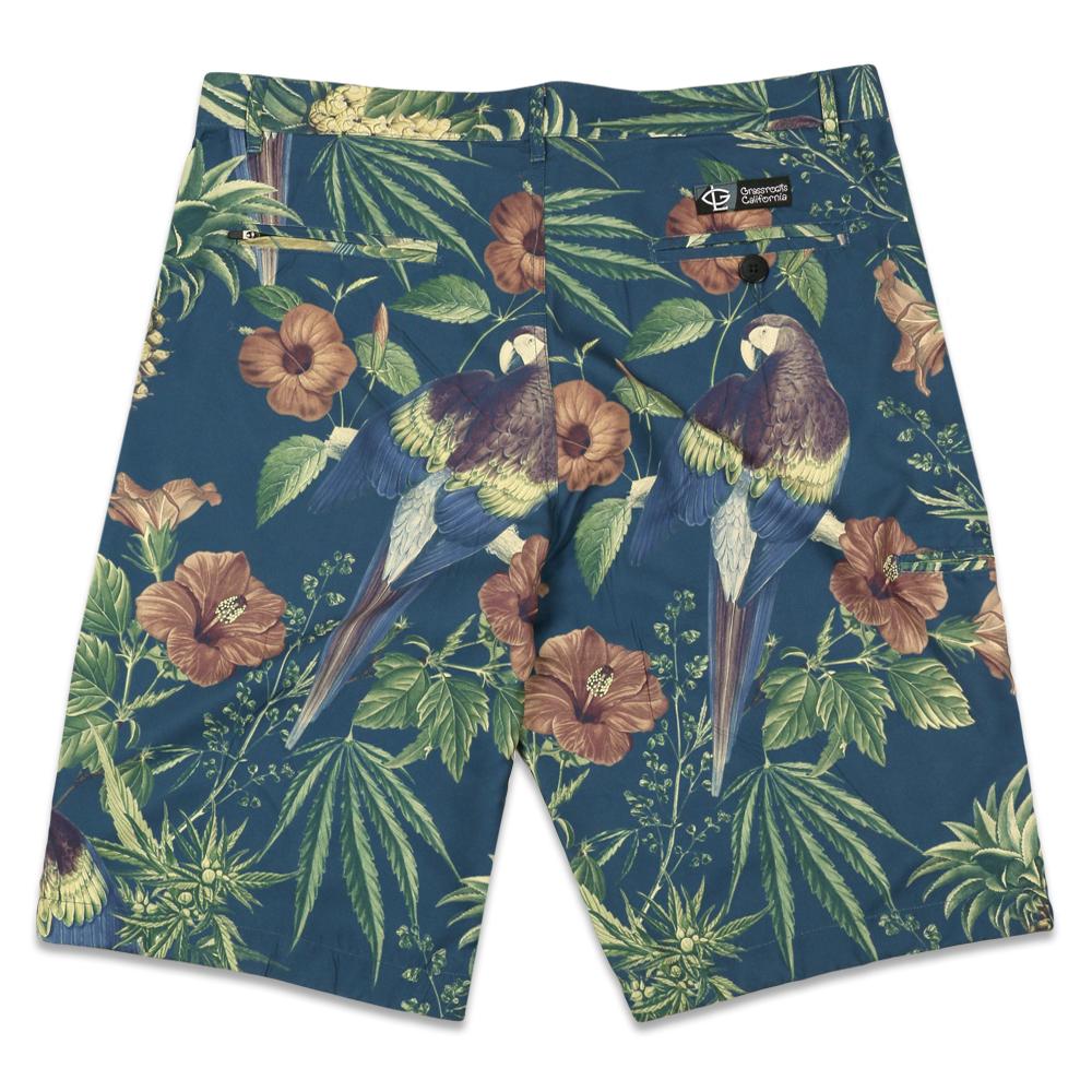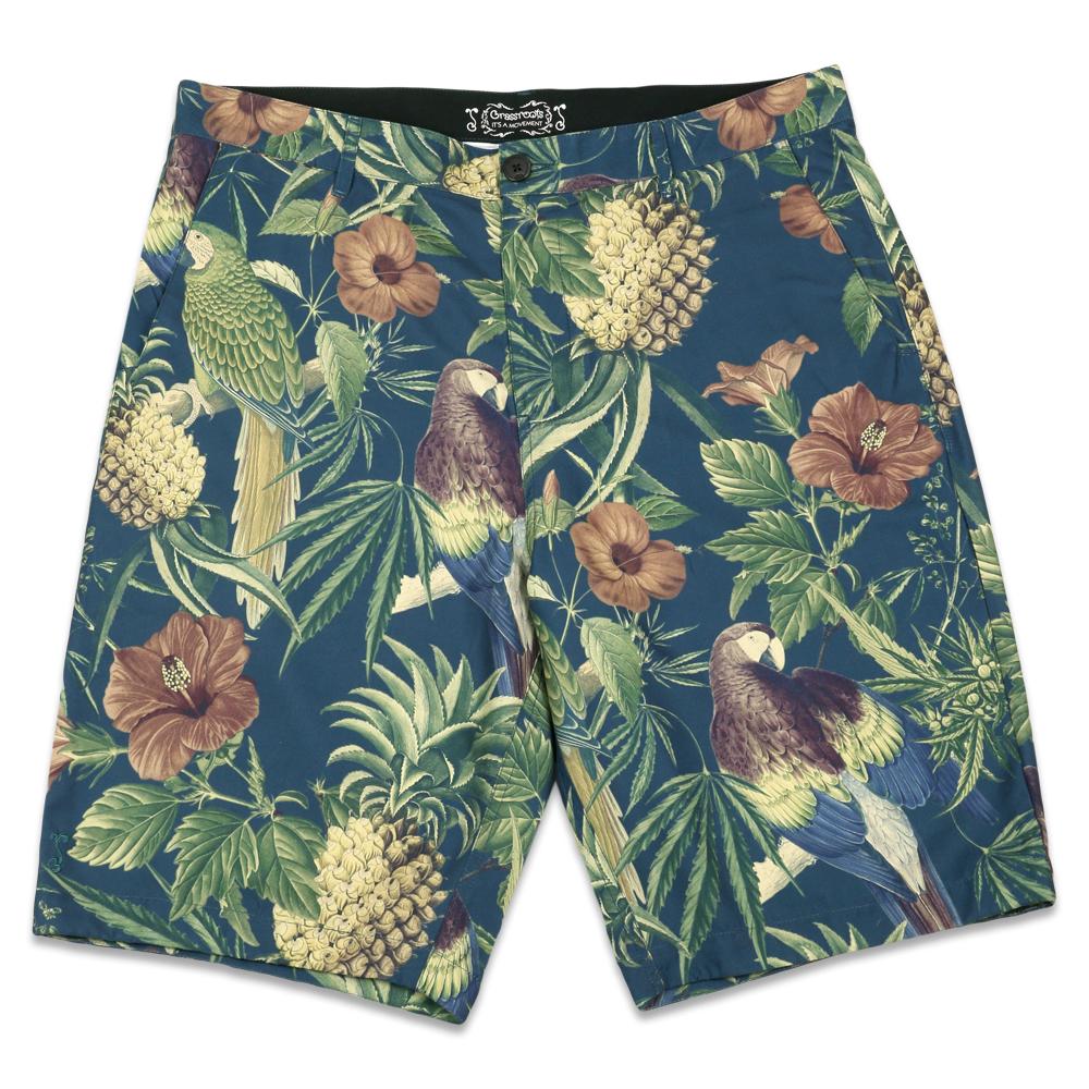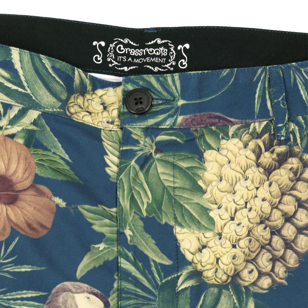 For those living large, our hybrid shorts double as swim trunks and dry quickly so you can get back on land in no time! These navy dad shorts feature the full-color print of the birds of paradise, pineapple, ganja, and hibiscus plants all-over. This subtle piece is as summery and fun as it is functional: check out the stash pocket on the back of the leg!