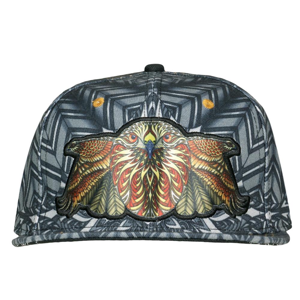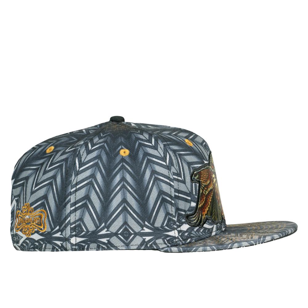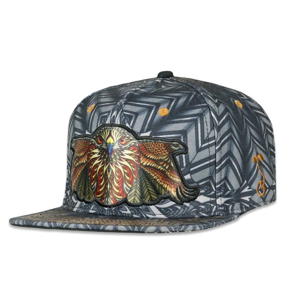This common bird of prey is known for it's beady eyes, reddish tail feathers, flight patterns, and classic kill strike. Phil Lewis takes on his interpretation of the raptor in this sublimated snapback.
