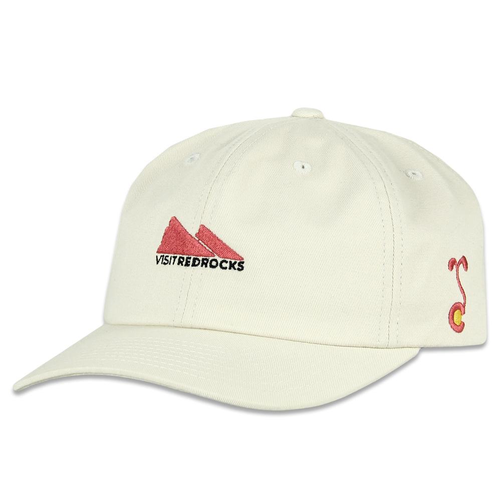 The Visit Red Rocks Cream Dad Hat is constructed of cream panels - featuring the Visit Red Rocks' logo embroidered on the front. This adjustable, one size fits most dad hat has Morrison, CO emroidered on the rear panels, and an adjustable snapback closure. The interior is unlined, but still has our infamous stash pocket.